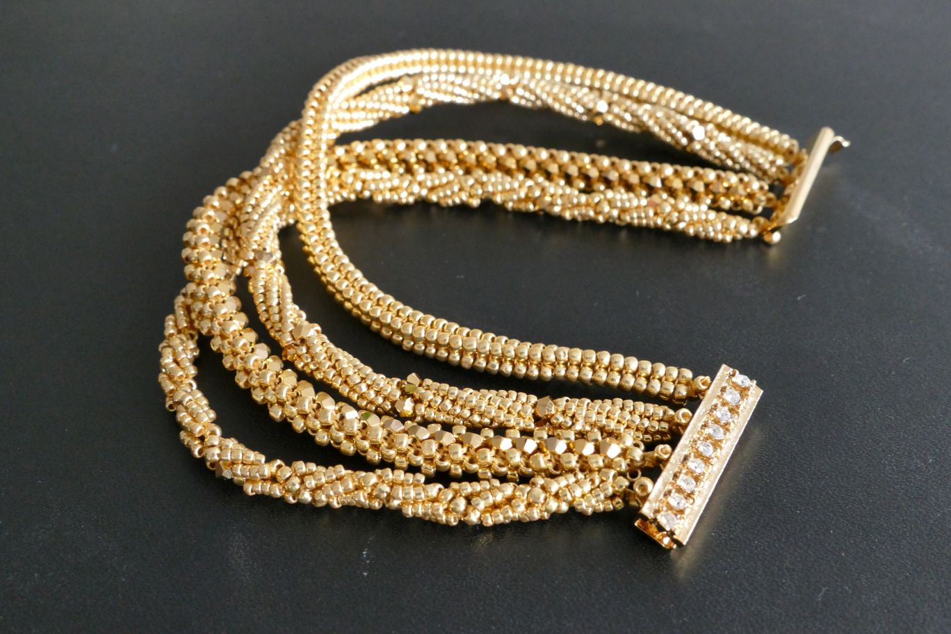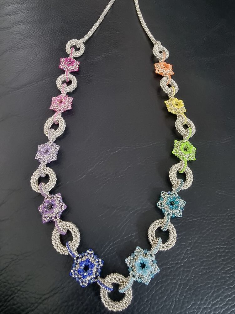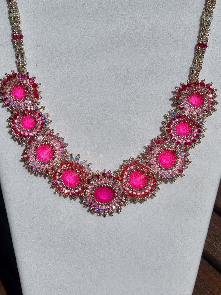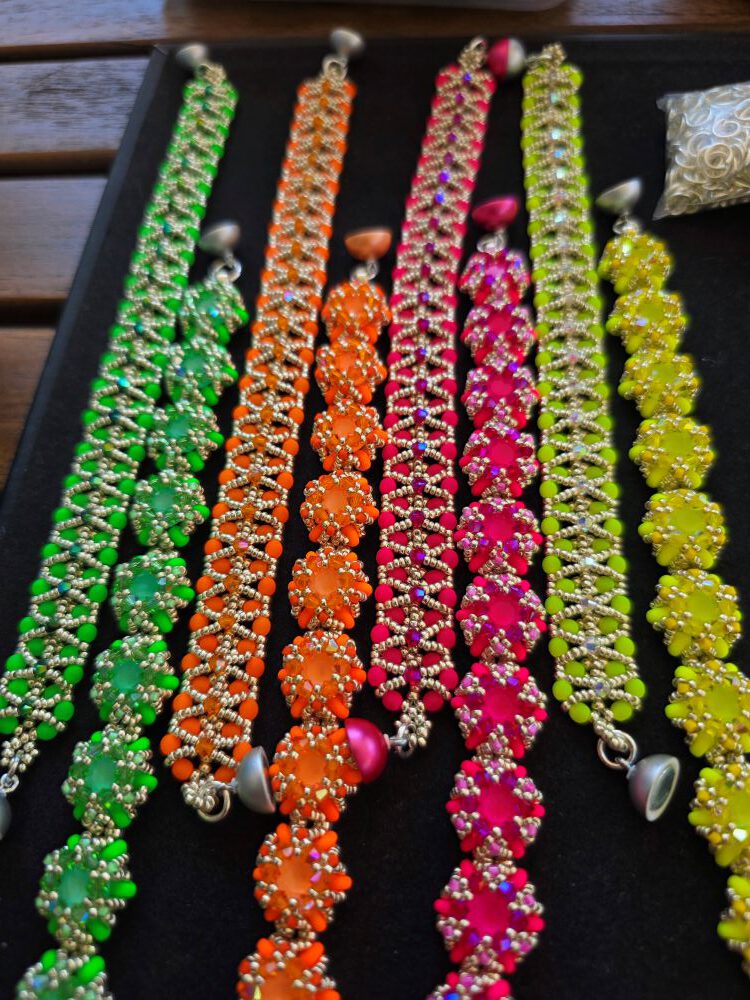 Die Schmuckstücke werden von mir in liebevoller Handarbeit hergestellt, nur hochwertige Materialien wie z.B. japanische Rocailles, österreichische Kristallperlen oder auch Naturperlen (Achat, Onyx, Chalzedon usw. ) werden verarbeitet (die kleinsten Perlen sind dabei nur ca. 1 mm groß)