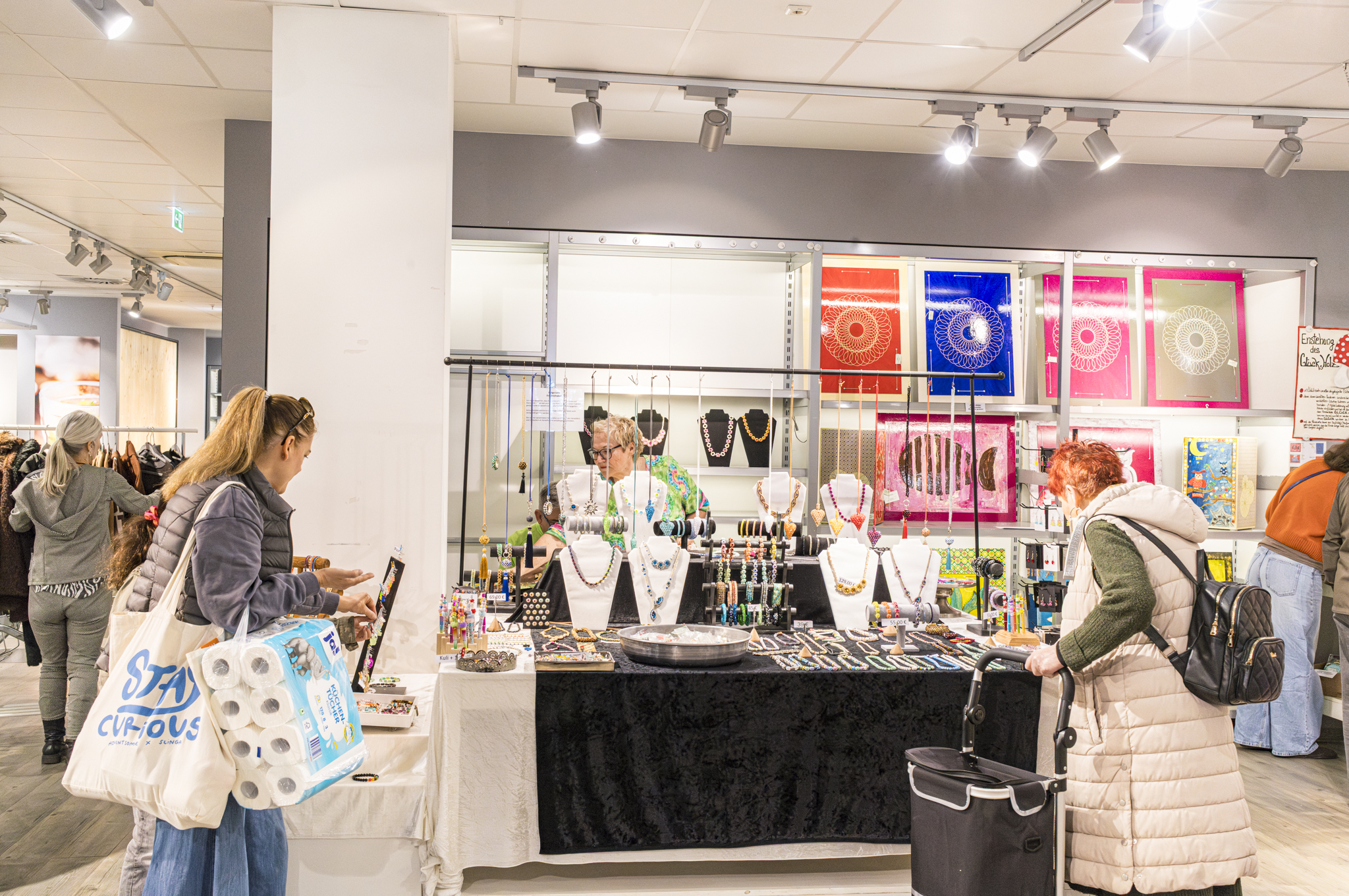 Der temporäre Laden versteht sich als Ort der Begegnung für Kunst und Kultur und bietet eine große Bandbreite künstlerischer Arbeiten. Zu sehen und zu erwerben sind unter anderem Aquarelle von Bianca Scheich, handgefertigter Glasperlenschmuck von Helga Lenz, Post- und Grußkarten sowie besondere Freundebücher für Erwachsene von Alissa Lerch, die unter dem Pseudonym Brina Stingmor arbeitet.